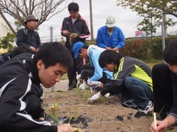 今日の農業体験は、大根の収穫でしたが、まだまだ物足りないという生徒は、たまねぎの苗の定植をさせてもらいました。たまねぎの苗ともなると、自分たちが食べているたまねぎに比べてとても小さくて弱々しいので、「大きく育つんだぞ」と思いながら、やさしく丁寧に植えました。