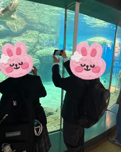 今回の遠足では、生徒たちがグループ単位で与えられたミッションをクリアするゲーム形式を取り入れました。大きな水槽の中を優雅に泳ぐウミガメや様々な魚たちの姿を観察しながら、楽しく学習に取り組む様子が見られました。