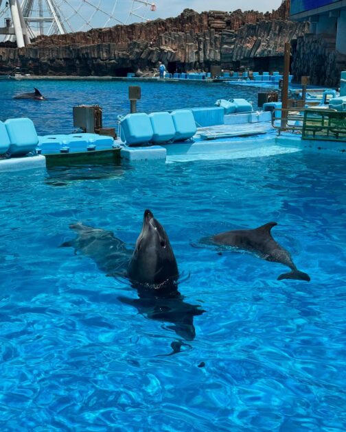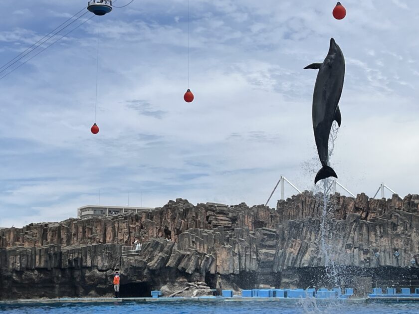 一番の人気はやはりイルカショー!華麗なジャンプとトレーナーさんとの息ピッタリな演技に大歓声が上がっていました。1年生はわざわざ最前列の席に座り、ジャンプしたイルカの水しぶきを浴びて大喜びする姿が印象的でした。