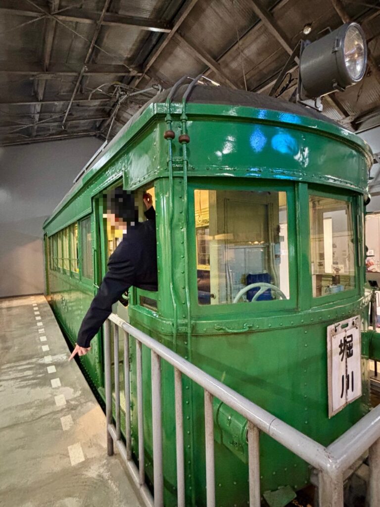 館内に入ると、昭和初期に実際に走っていた路面電車「モ754号」と「モ513号」が展示されており、なんと車内に入ることができます!レトロな木製の座席や吊り革に触れながら、当時の乗客の気分を味わうことができました。